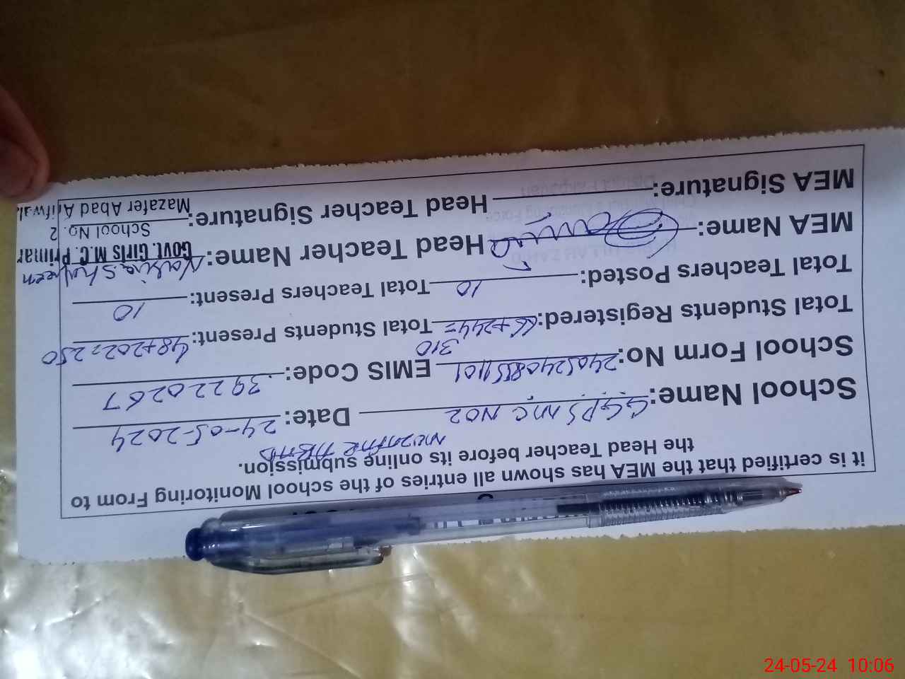 | Name: NA**** SH**** Designation: (School Headmaster's/Headmistress's) PST Phone/Cell Number: 03**** |