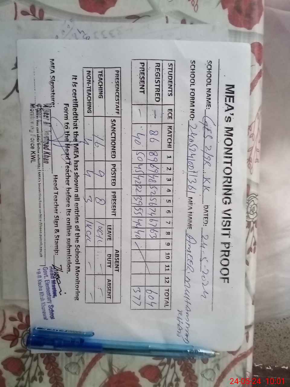 | Attendance Register | Head Teacher | MEA with School | Visit Proof |