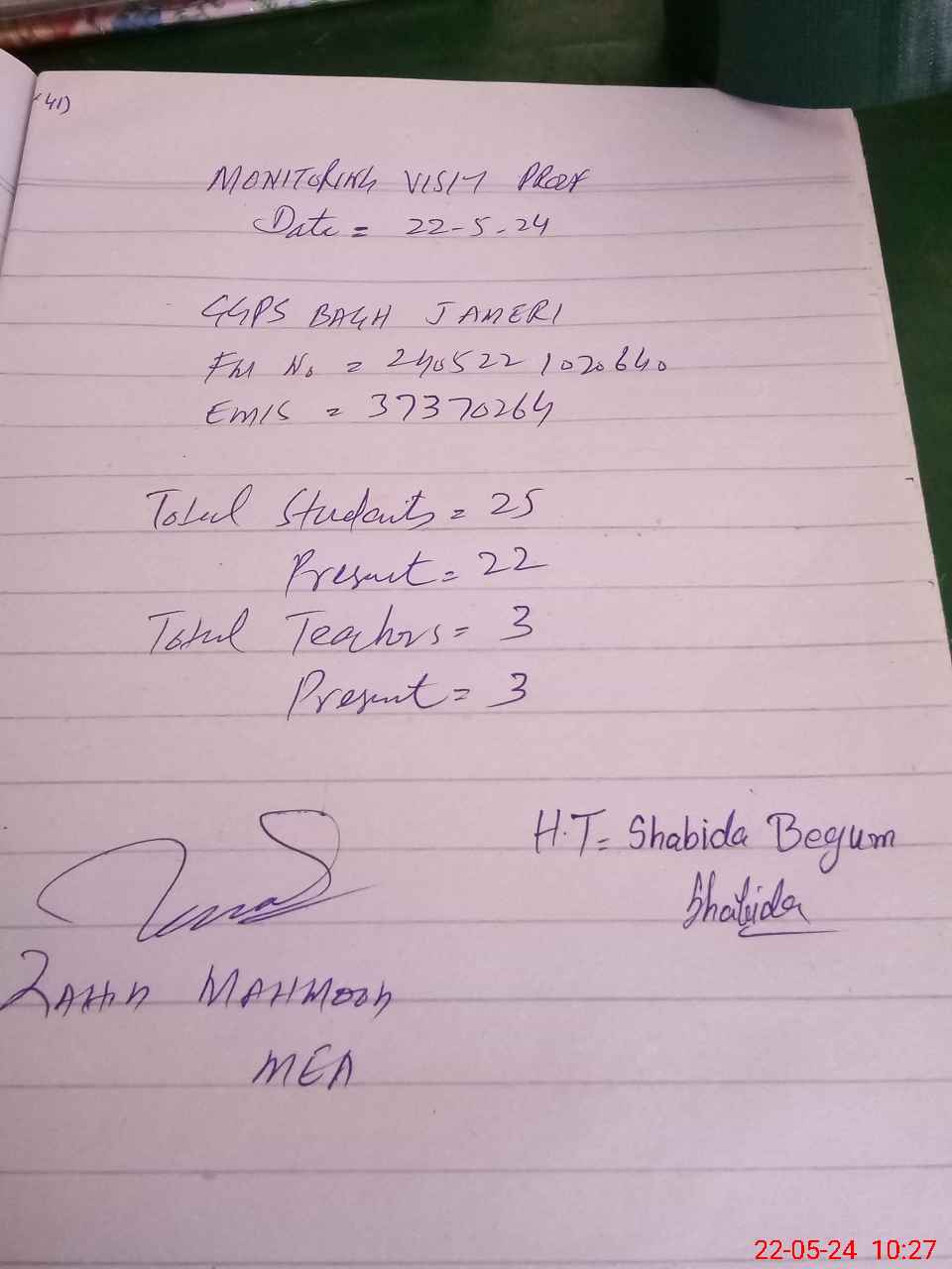 | Attendance Register | Head Teacher | MEA with School | Visit Proof |