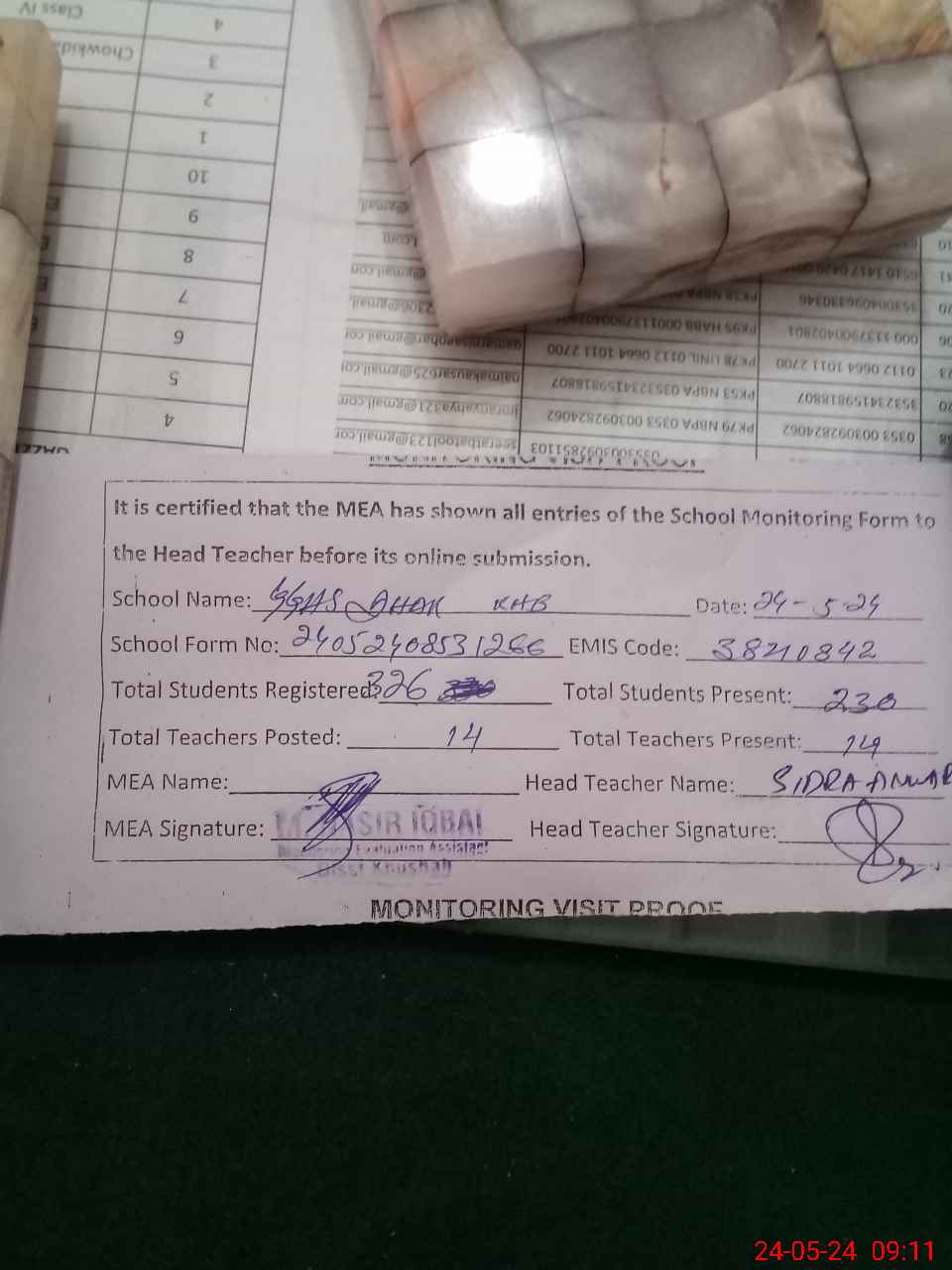 | Certified that this School was Inspected by the Undersigned MEA/DMO Today and the Information Stated Above is as Per Record. | |||||