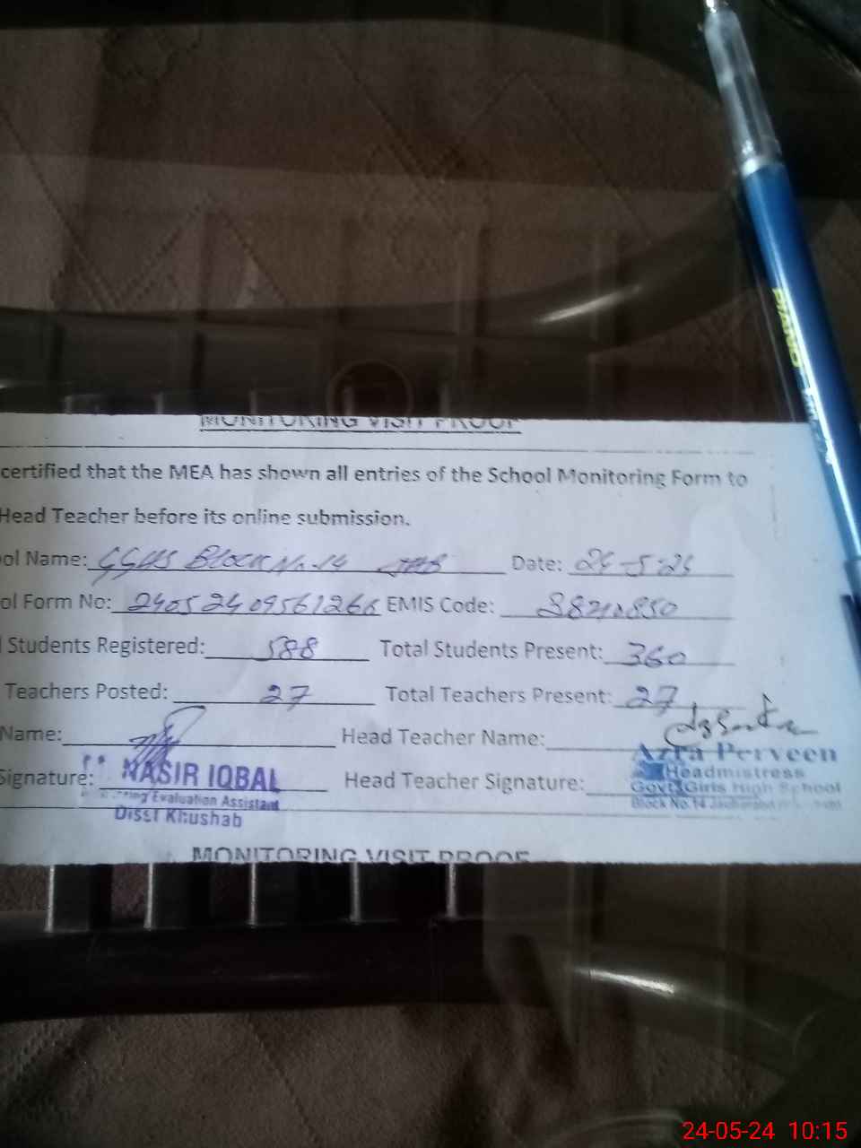 | Monitoring Date: 24-05-2024 | Start Time: 24-05-2024 09:30 AM | End Time: 24-05-2024 10:16 AM | Name of MEA: MU**** NA**** IQ**** | |