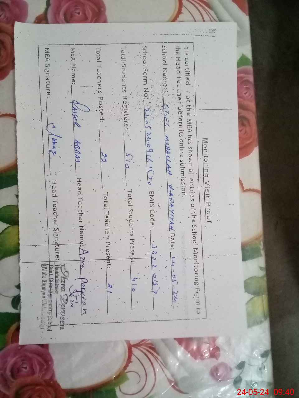 | Name: Az**** pe**** Designation: (School Headmaster's/Headmistress's) sse Phone/Cell Number: 03**** |