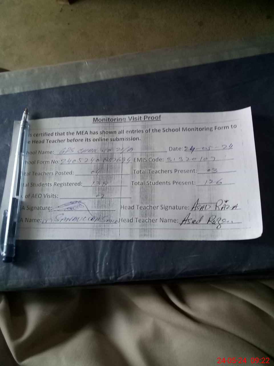 | Attendance Register | Head Teacher | MEA with School | Visit Proof |