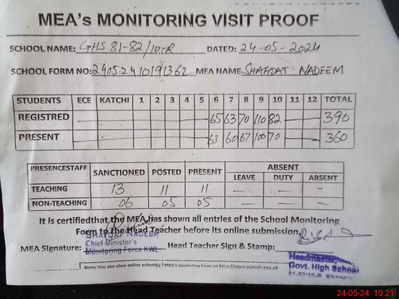 | EMIS Code: 36420010 | Name of School: GHS 81-82/10-R, KHANEWAL | |||