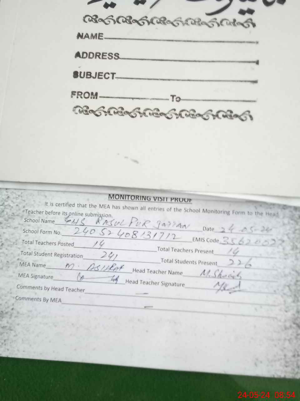 | Attendance Register | Head Teacher | MEA with School | Visit Proof |