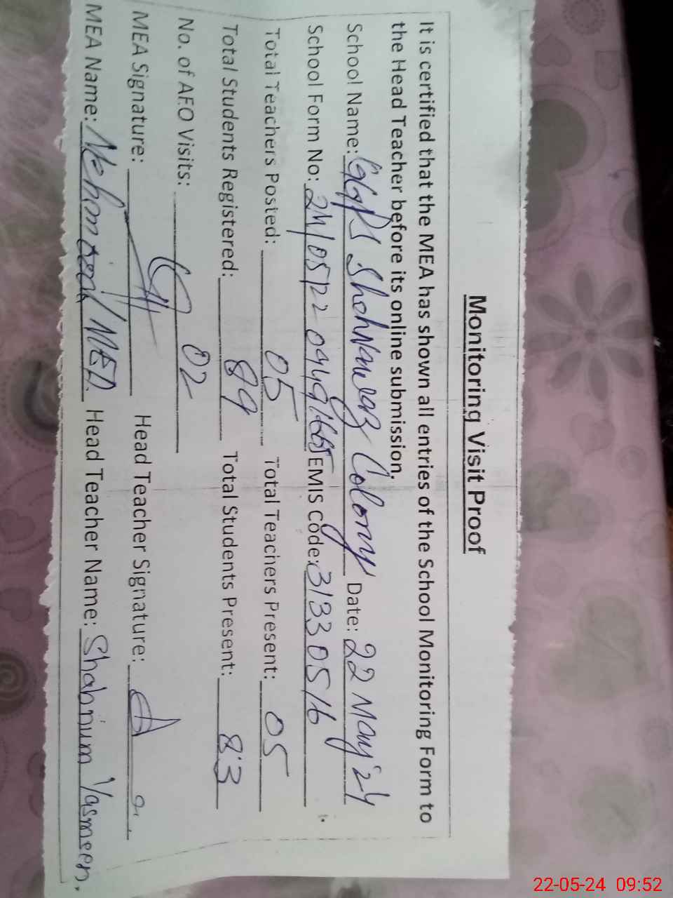 | Monitoring Date: 22-05-2024 | Start Time: 22-05-2024 09:30 AM | End Time: 22-05-2024 10:04 AM | Name of MEA: Ma**** UlHa**** | |