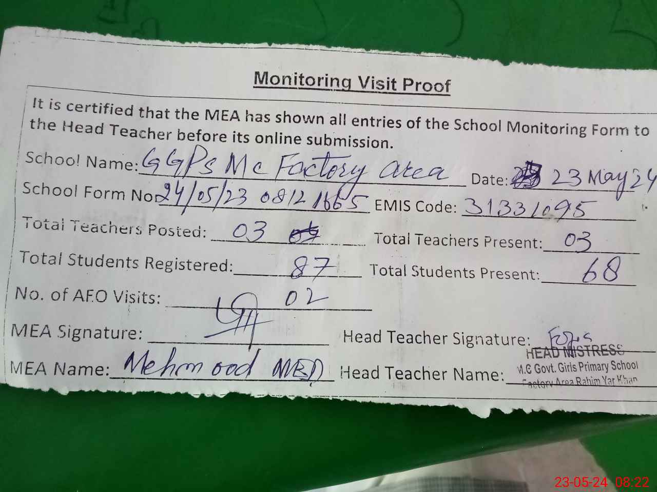 | Monitoring Date: 23-05-2024 | Start Time: 23-05-2024 07:51 AM | End Time: 23-05-2024 08:22 AM | Name of MEA: Ma**** UlHa**** | |