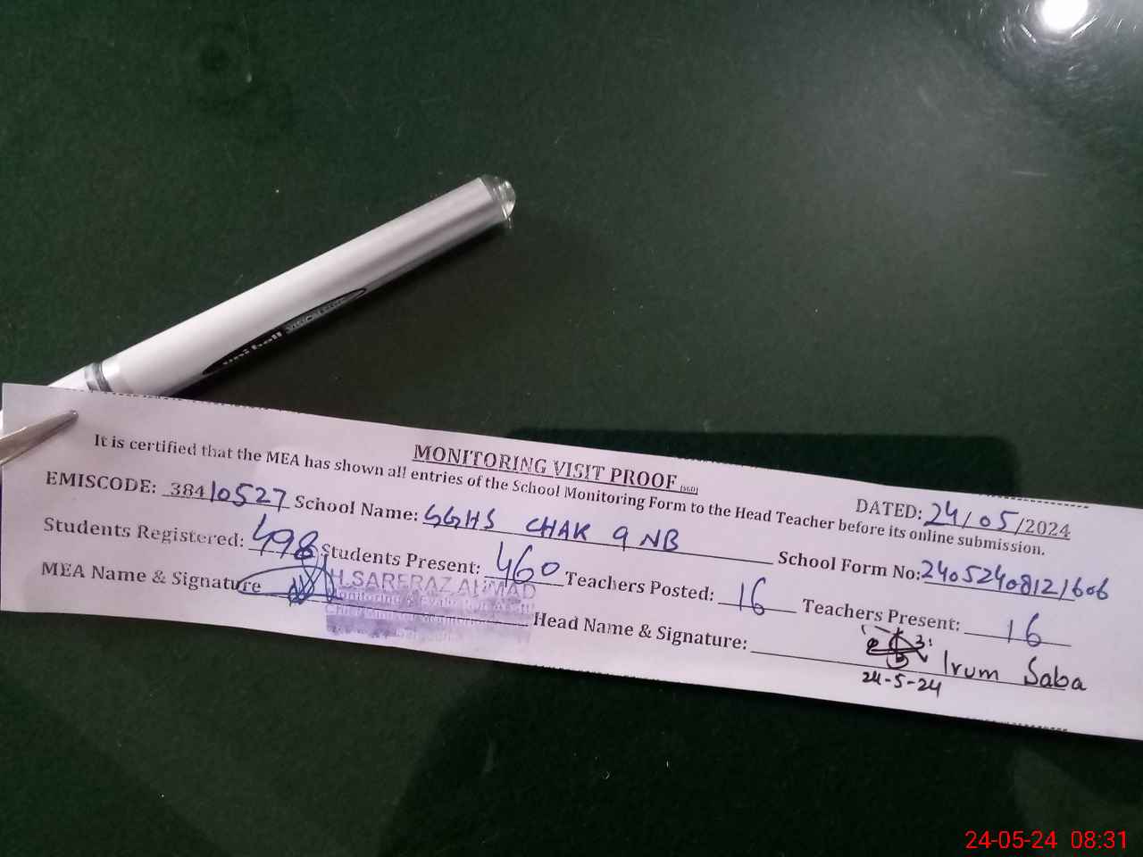 | Attendance Register | Head Teacher | MEA with School | Visit Proof |