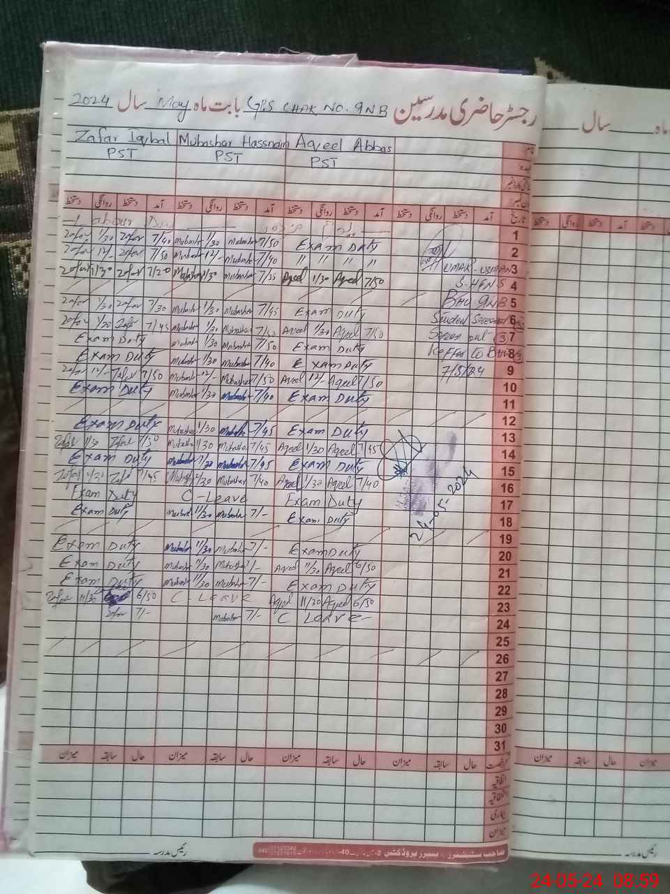 | CNIC | Full Name | Designation | R/C | Absence During Last Calender Month |