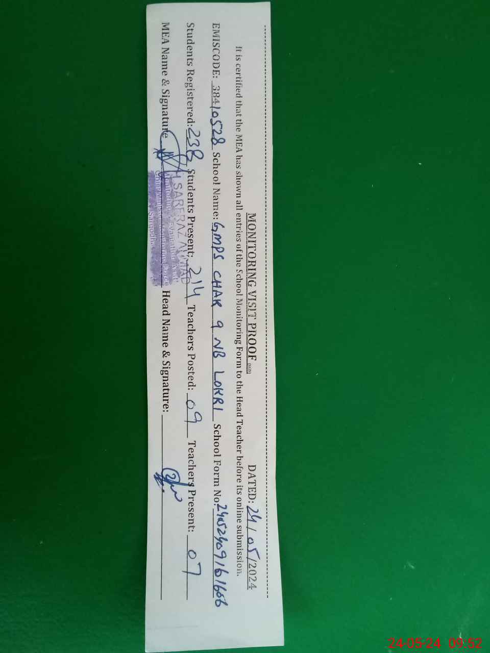 | Certified that this School was Inspected by the Undersigned MEA/DMO Today and the Information Stated Above is as Per Record. | |||||