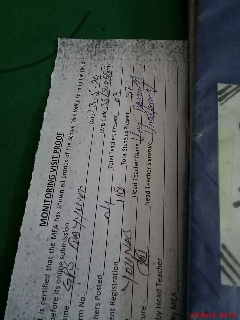 | Attendance Register | Head Teacher | MEA with School | Visit Proof |