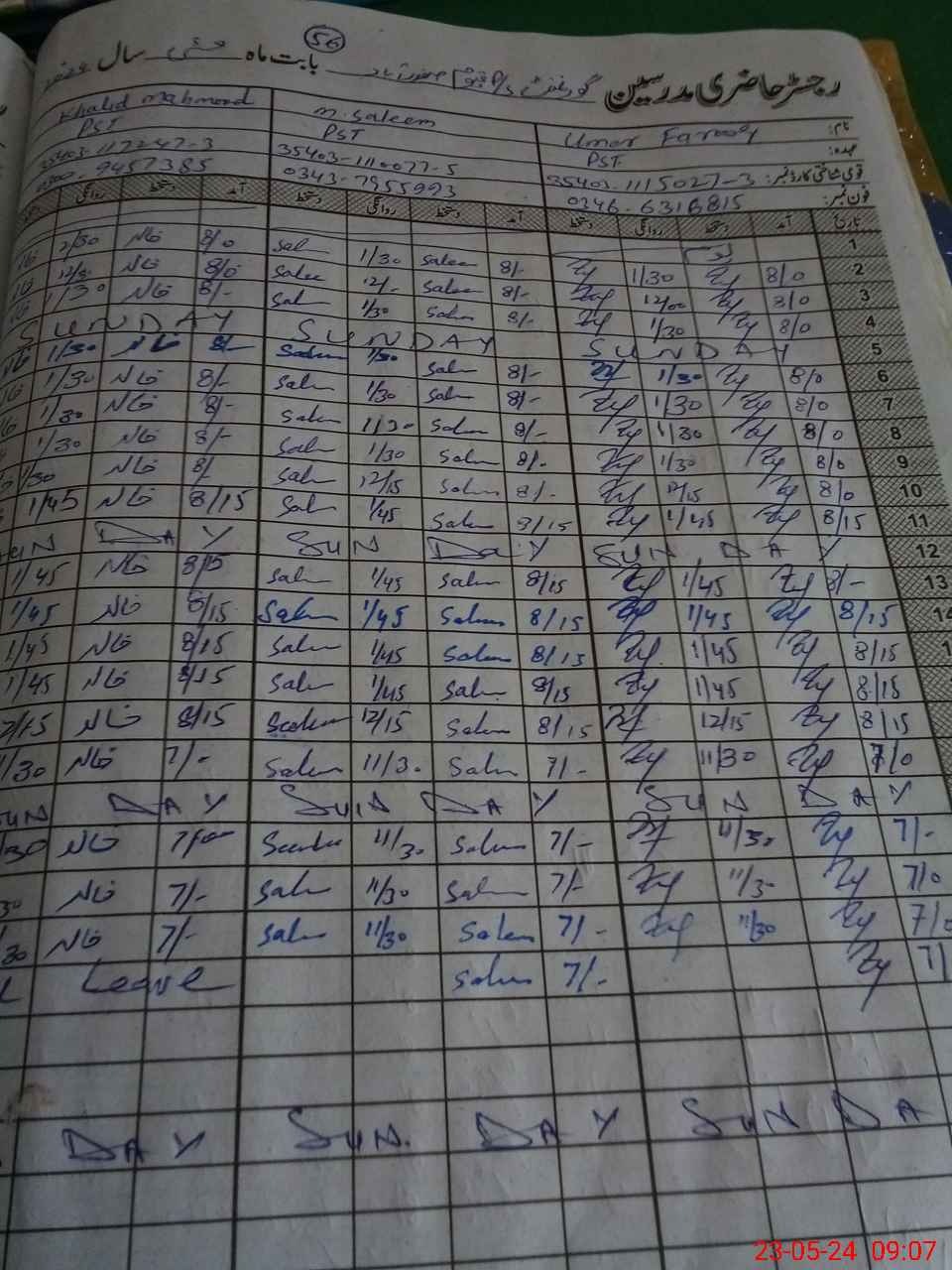 | CNIC | Full Name | Designation | R/C | Absence During Last Calender Month |