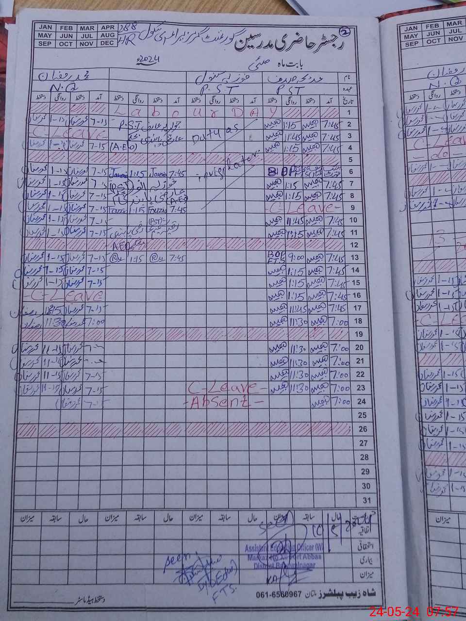 | CNIC | Full Name | Designation | R/C | Absence During Last Calender Month |