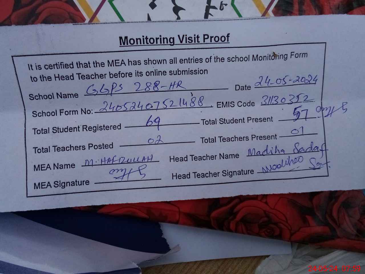 | Attendance Register | Head Teacher | MEA with School | Visit Proof |