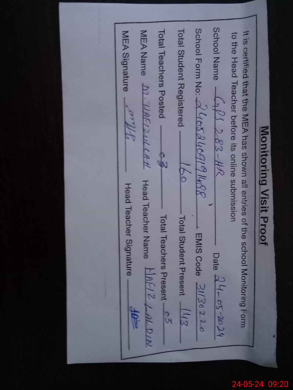 | Certified that this School was Inspected by the Undersigned MEA/DMO Today and the Information Stated Above is as Per Record. | |||||
