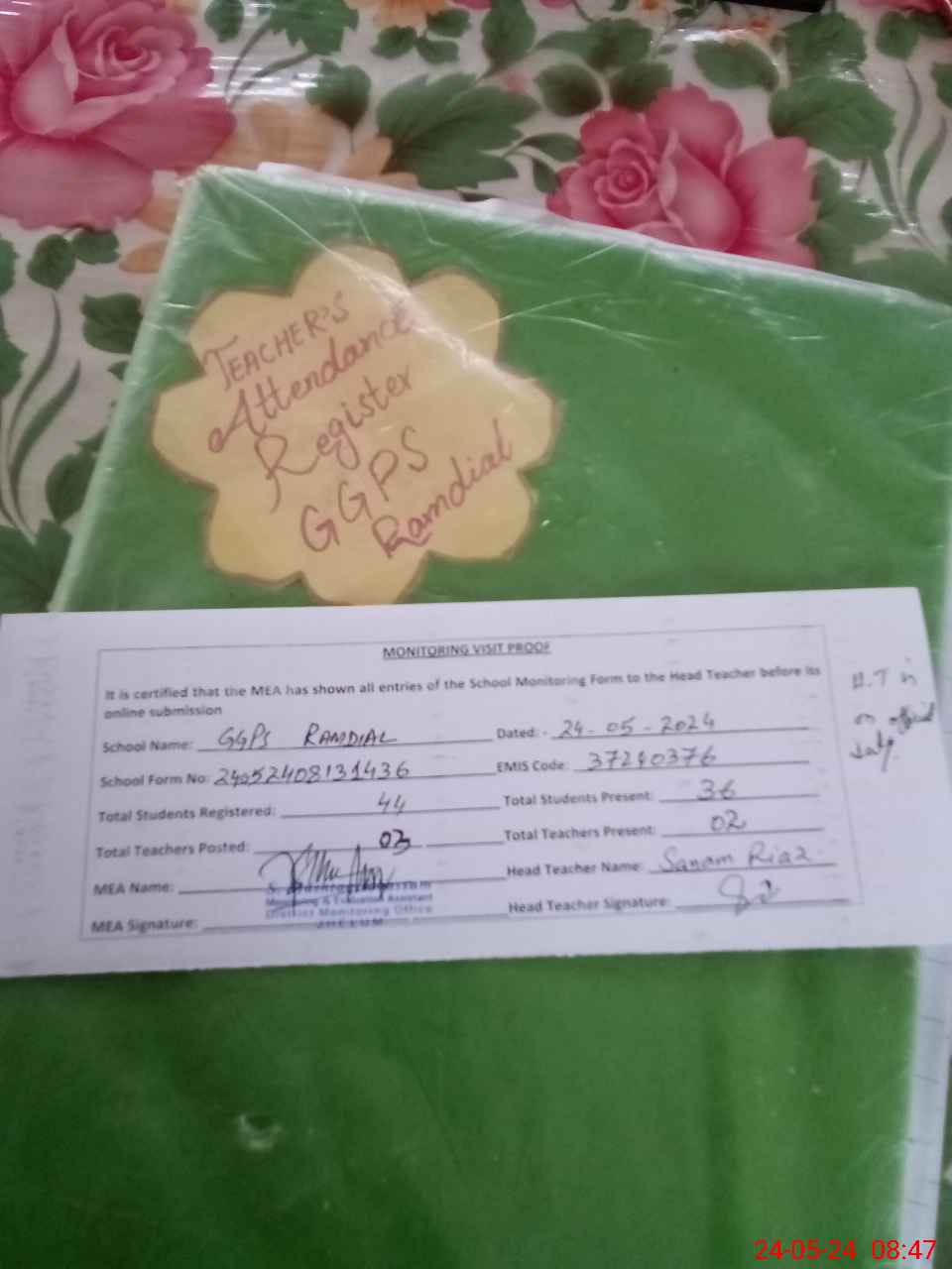 | Attendance Register | Head Teacher | MEA with School | Visit Proof |