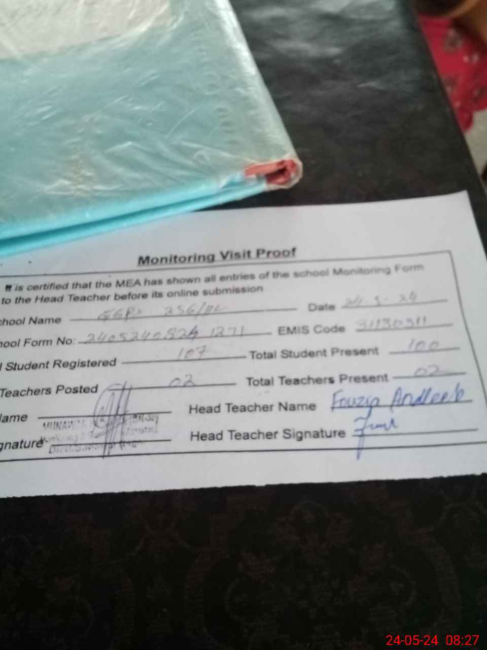 | Attendance Register | Head Teacher | MEA with School | Visit Proof |