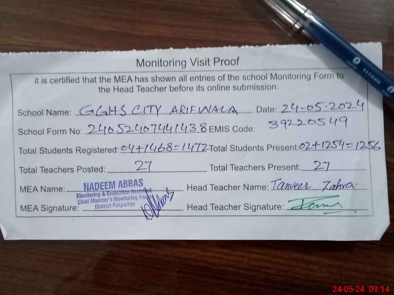 | Attendance Register | Head Teacher | MEA with School | Visit Proof |
