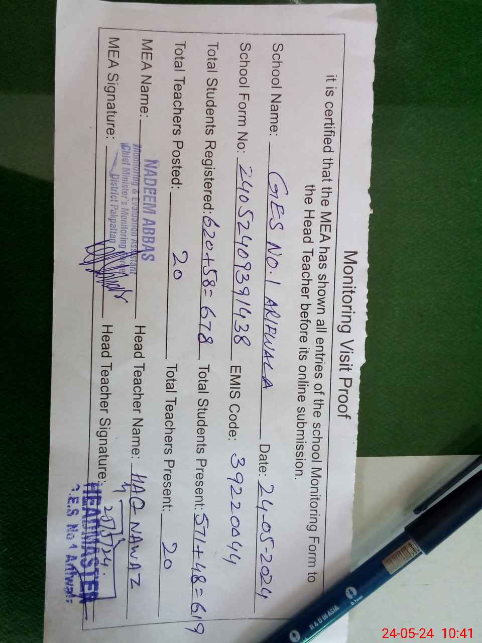 | Attendance Register | Head Teacher | MEA with School | Visit Proof |