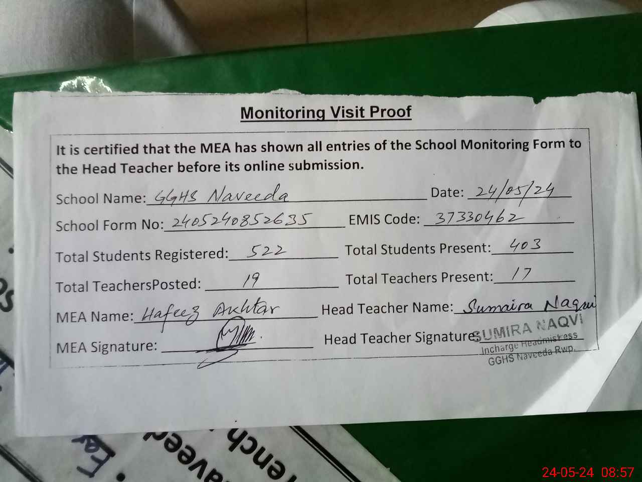 | Monitoring Date: 24-05-2024 | Start Time: 24-05-2024 08:35 AM | End Time: 24-05-2024 09:01 AM | Name of MEA: Sy**** Ha**** Ak**** | |