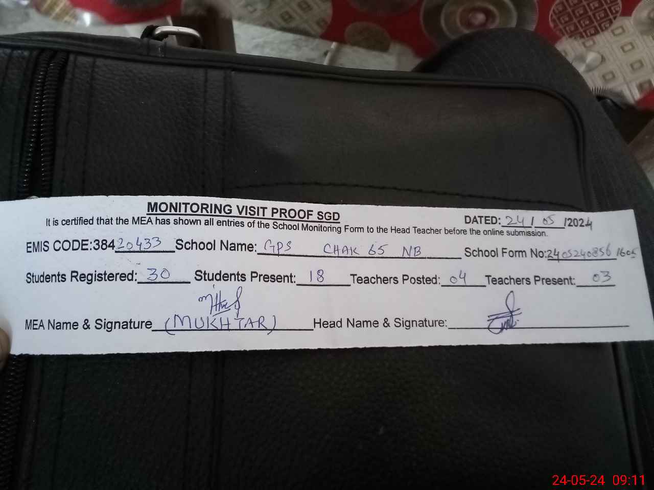 | EMIS Code: 38420433 | Name of School: GPS CHAK NO.65 NB | |||