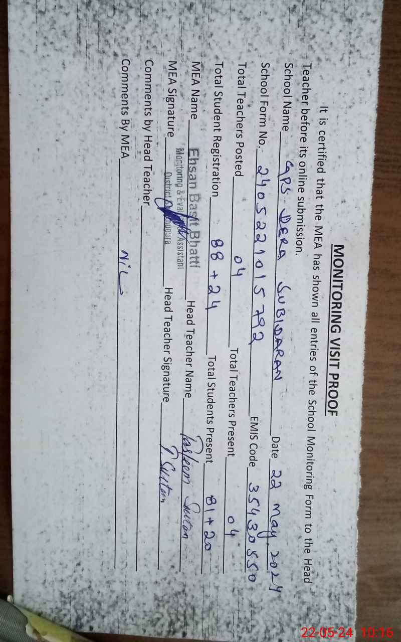 | EMIS Code: 35430550 | Name of School: GPS DERA SUBIDARAN | |||