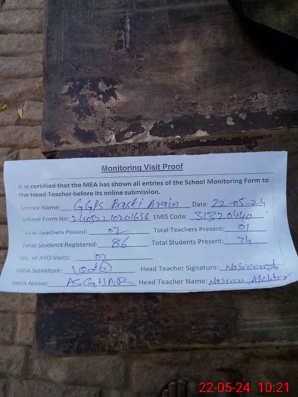 | EMIS Code: 31320440 | Name of School: GGPS BASTI ARAIN | |||