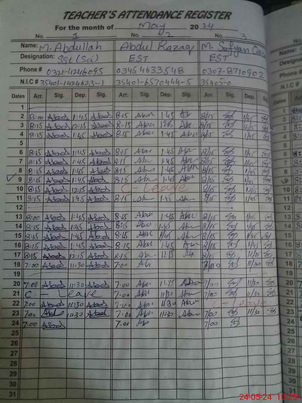 | CNIC | Full Name | Designation | R/C | Absence during last cal. month |