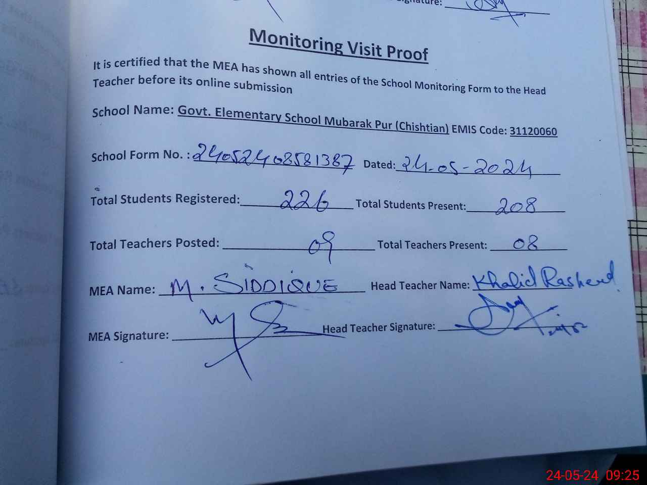 | Certified that this School was Inspected by the Undersigned MEA/DMO Today and the Information Stated Above is as Per Record. | |||||