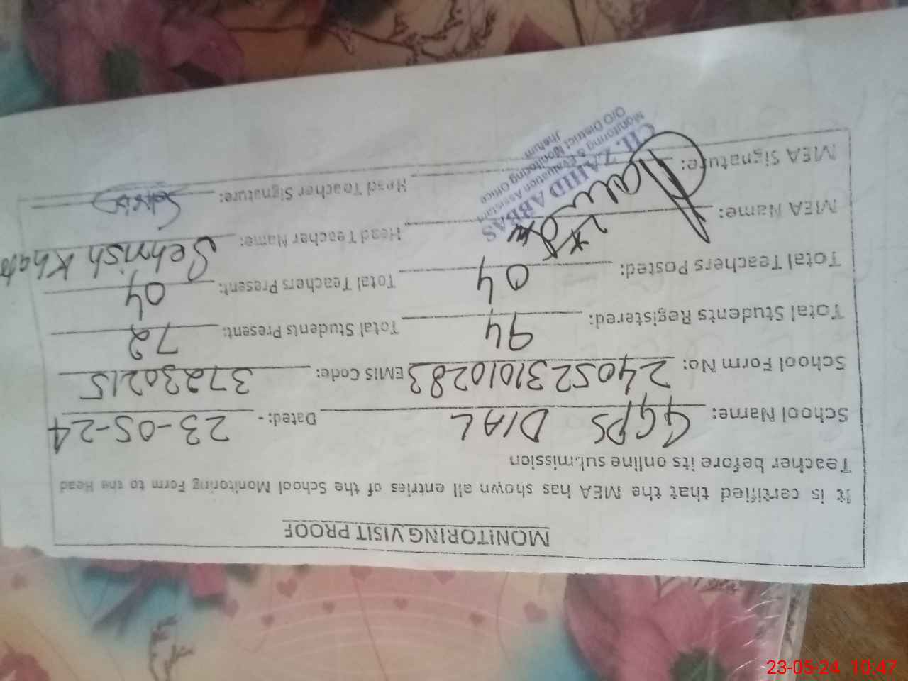 | Certified that this School was Inspected by the Undersigned MEA/DMO Today and the Information Stated Above is as Per Record. | |||||