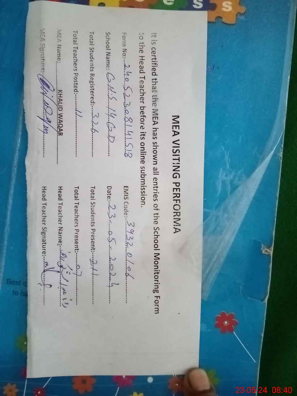 | Certified that this School was Inspected by the Undersigned MEA/DMO Today and the Information Stated Above is as Per Record. | |||||