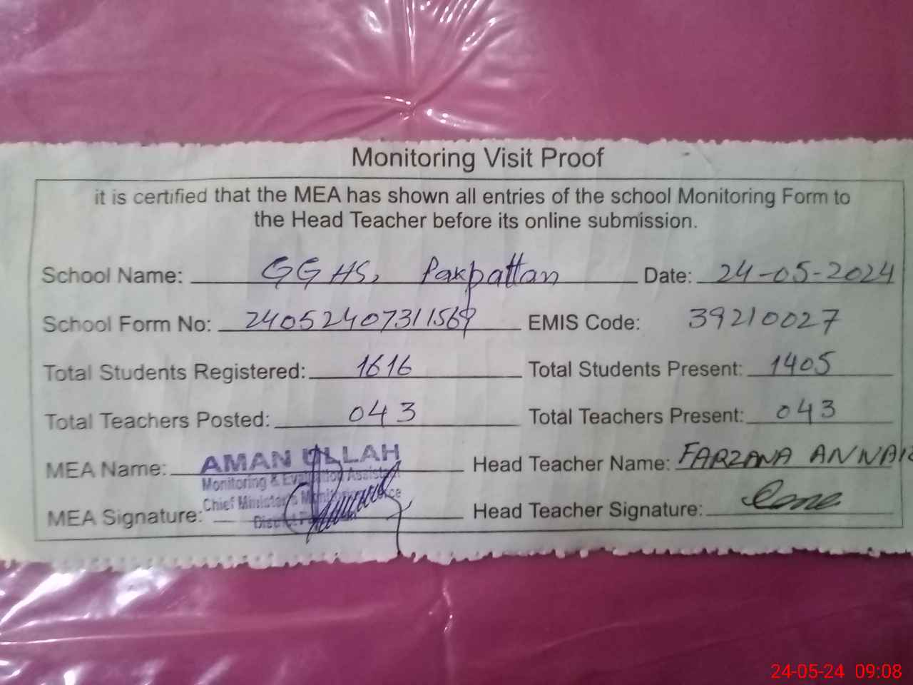 | Attendance Register | Head Teacher | MEA with School | Visit Proof |
