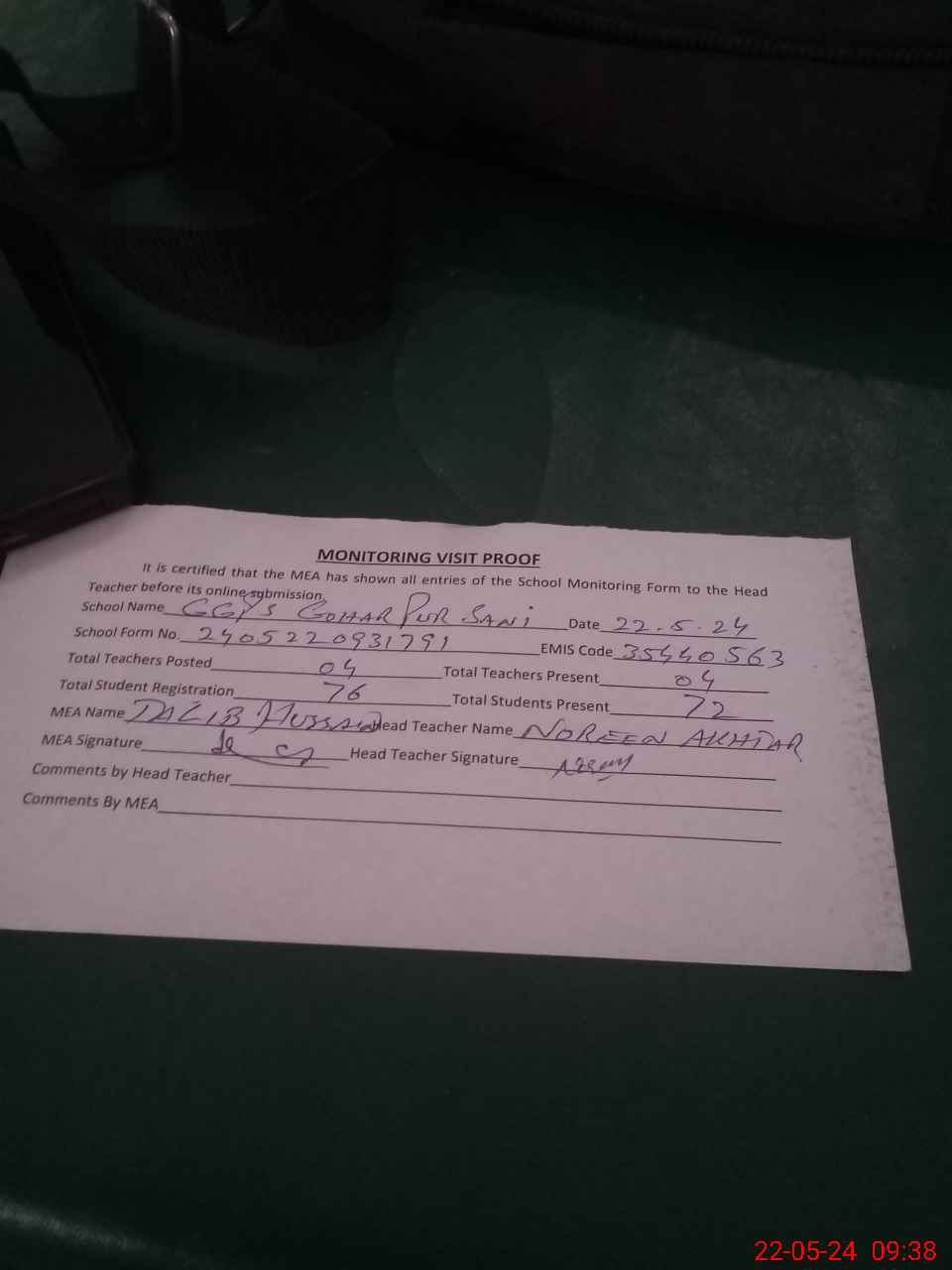 | Attendance Register | Head Teacher | MEA with School | Visit Proof |