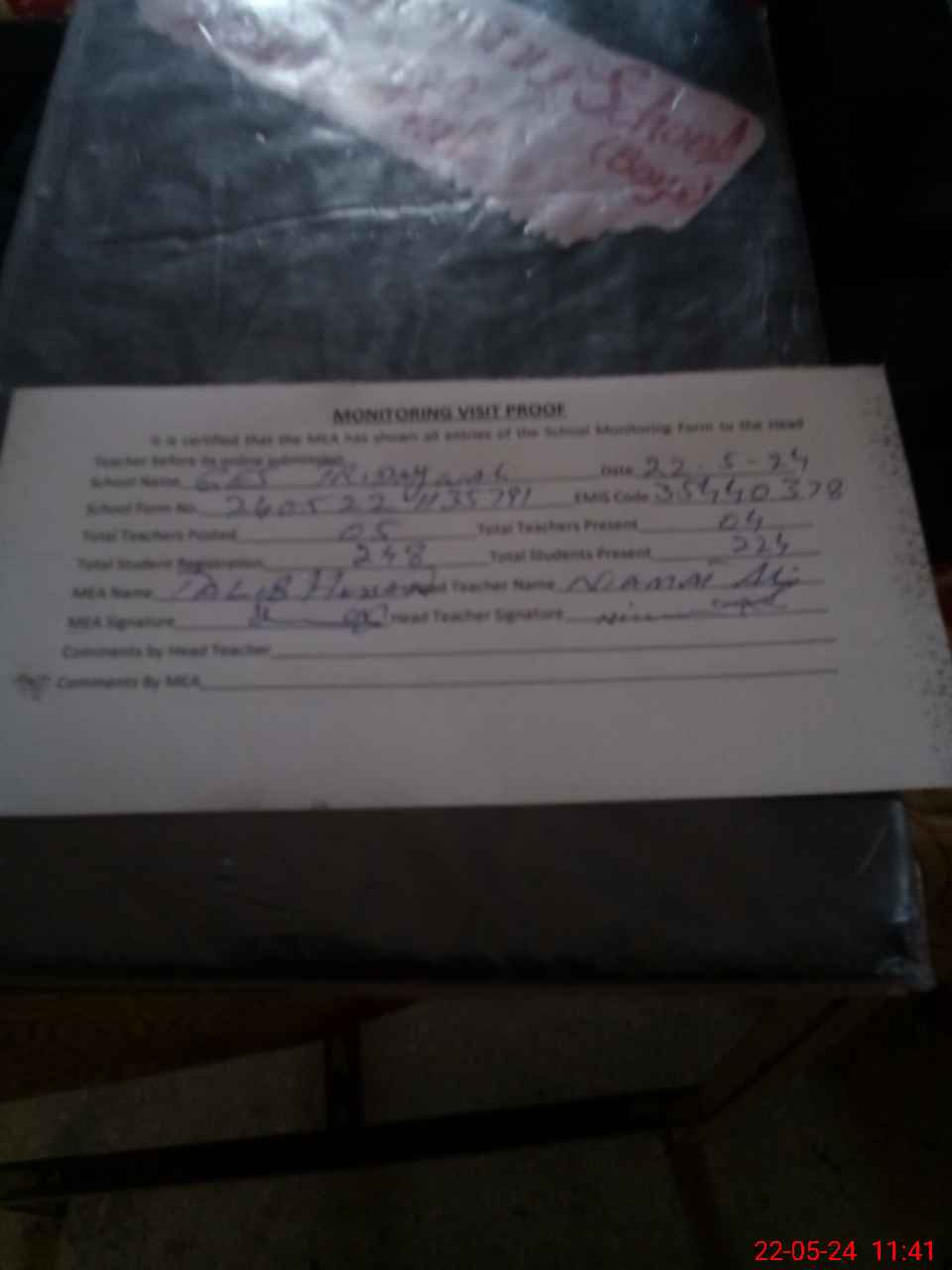 | Attendance Register | Head Teacher | MEA with School | Visit Proof |