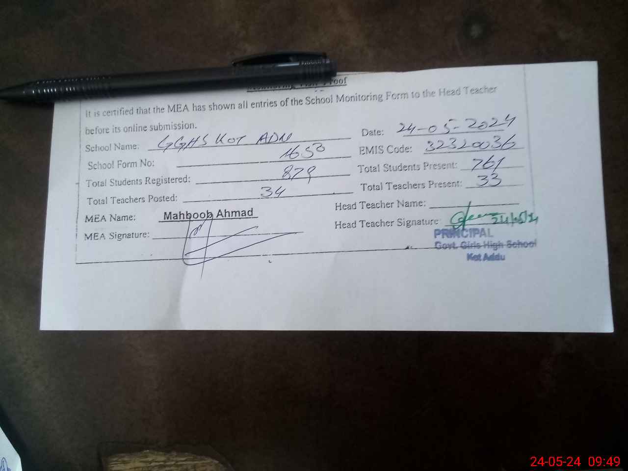 | Certified that this School was Inspected by the Undersigned MEA/DMO Today and the Information Stated Above is as Per Record. | |||||