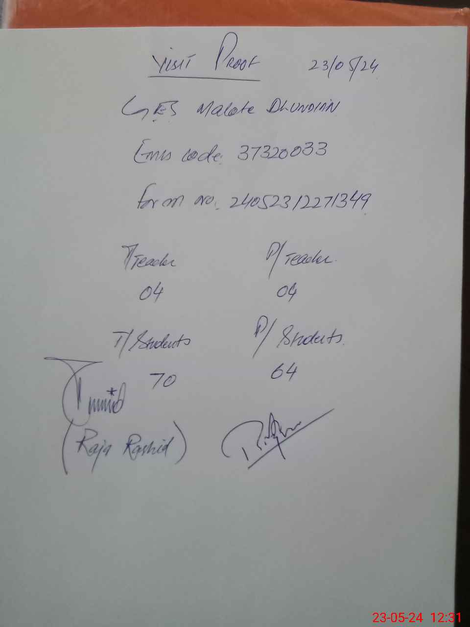 | Attendance Register | Head Teacher | MEA with School | Visit Proof |