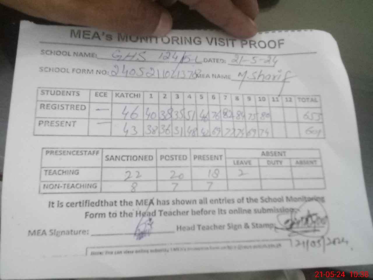 | Attendance Register | Head Teacher | MEA with School | Visit Proof |