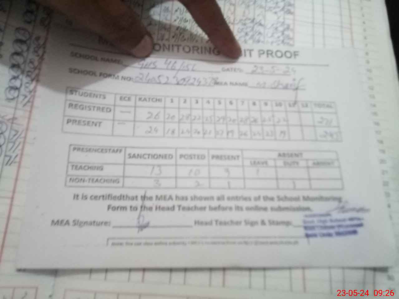 | Attendance Register | Head Teacher | MEA with School | Visit Proof |