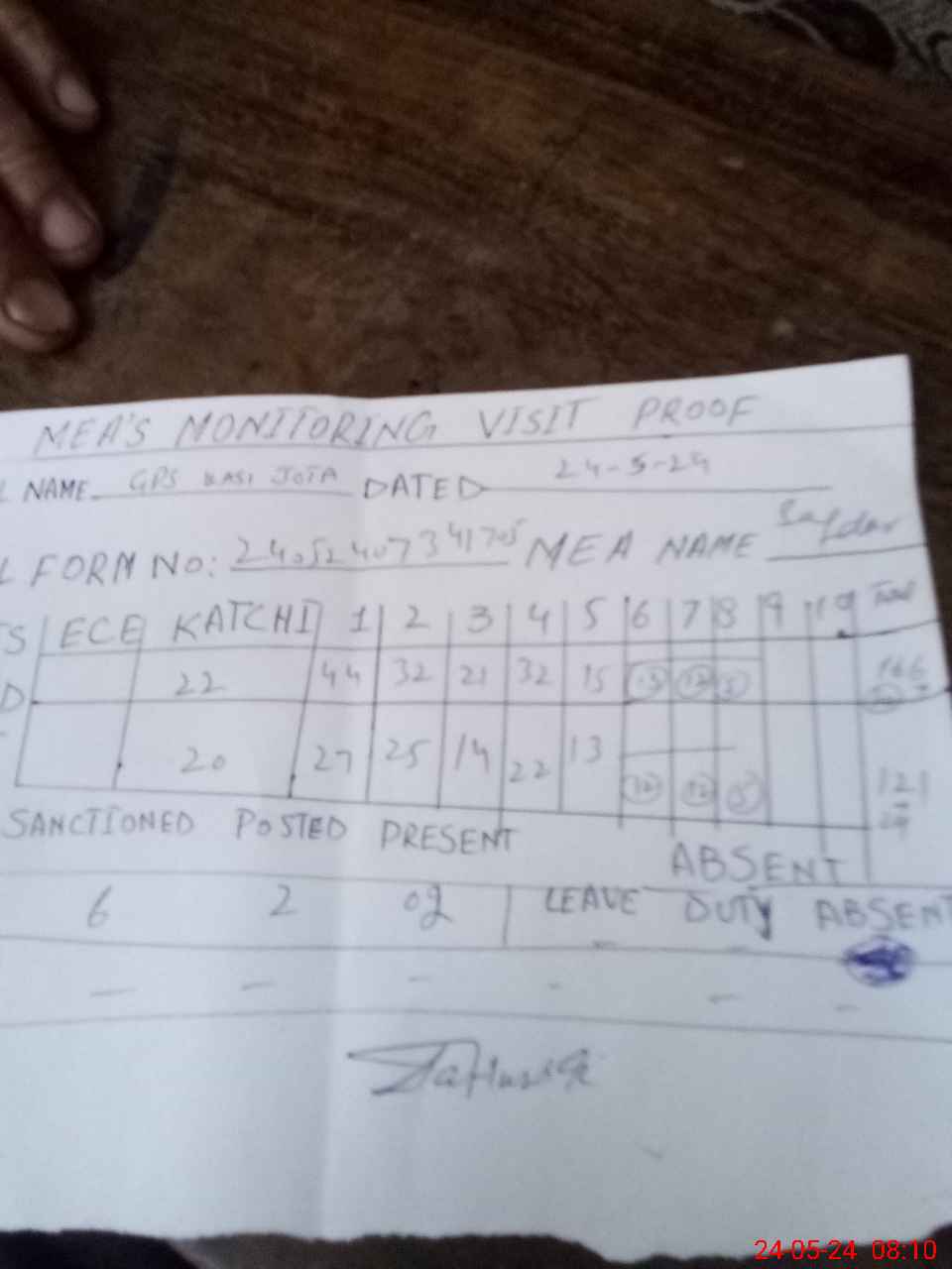 | Attendance Register | Head Teacher | MEA with School | Visit Proof |