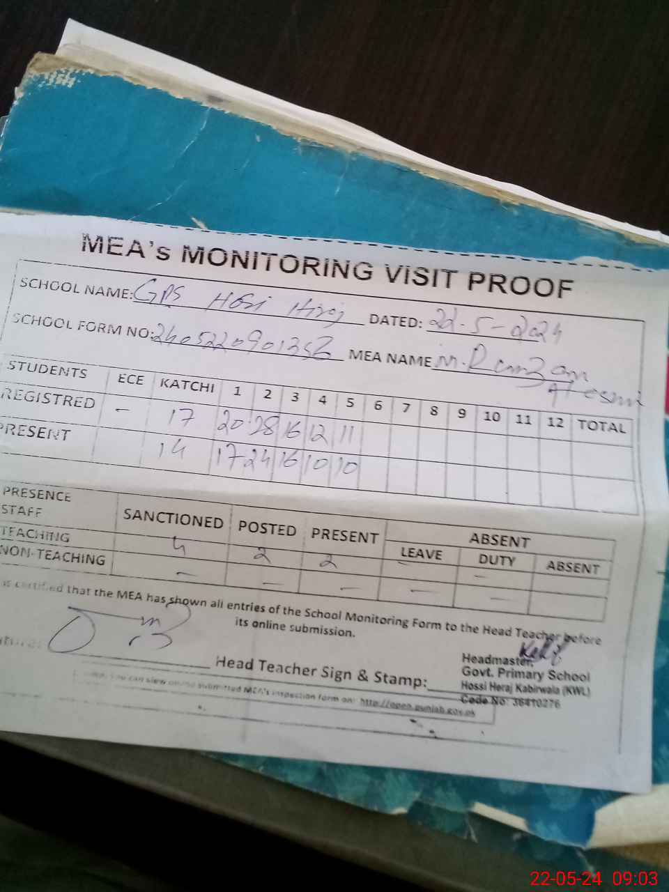 | Attendance Register | Head Teacher | MEA with School | Visit Proof |