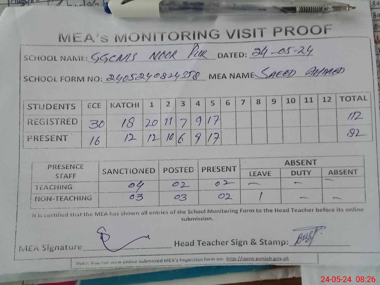 | EMIS Code: 36410350 | Name of School: GGCMS NOOR PUR, KABIRWALA | |||