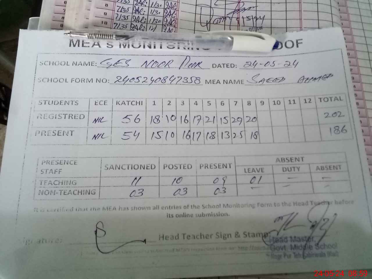 | Monitoring Date: 24-05-2024 | Start Time: 24-05-2024 08:34 AM | End Time: 24-05-2024 09:31 AM | Name of MEA: Sa**** Ah**** | |