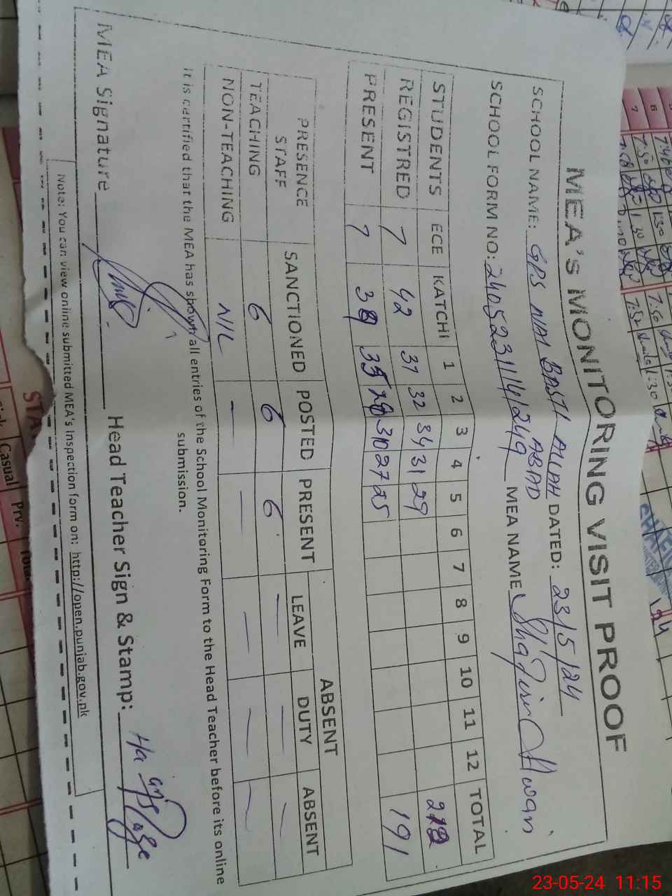 | Attendance Register | Head Teacher | MEA with School | Visit Proof |