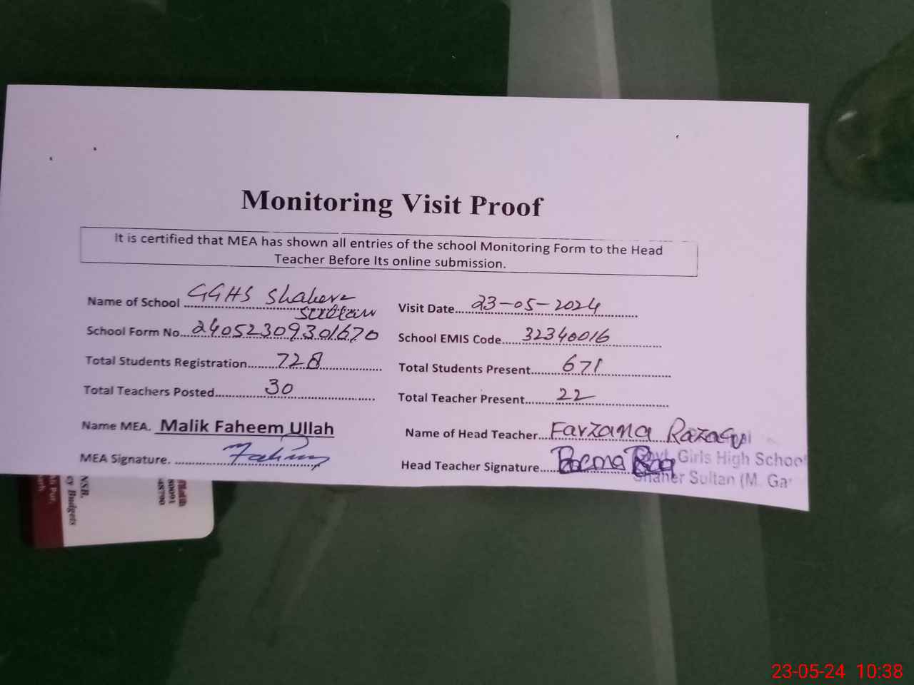 | Attendance Register | Head Teacher | MEA with School | Visit Proof |