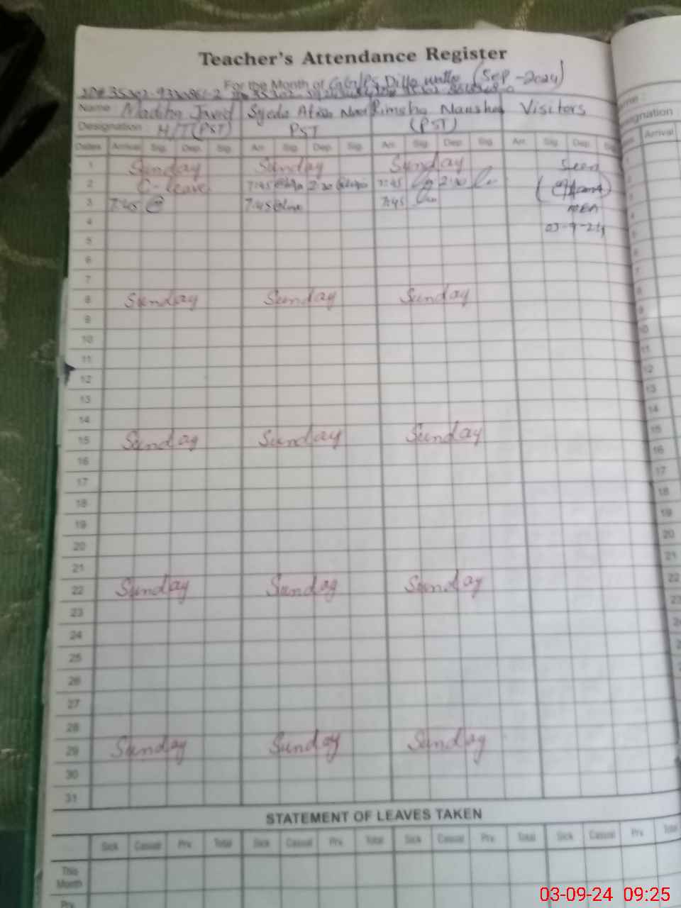 | CNIC | Full Name | Designation | R/C | Absence During Last Calender Month |