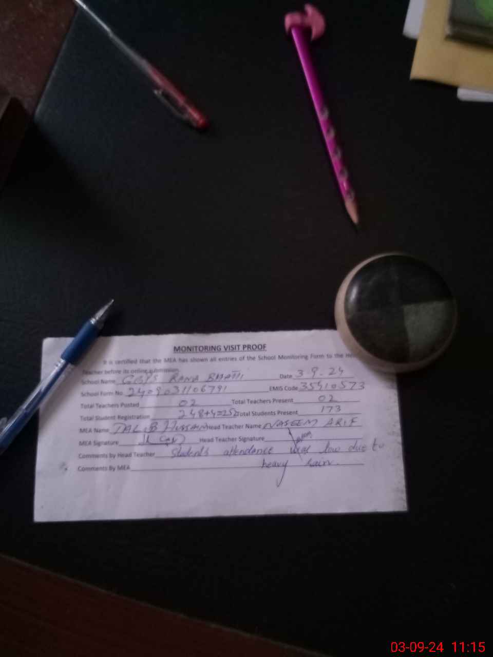 | Attendance Register | Head Teacher | MEA with School | Visit Proof |