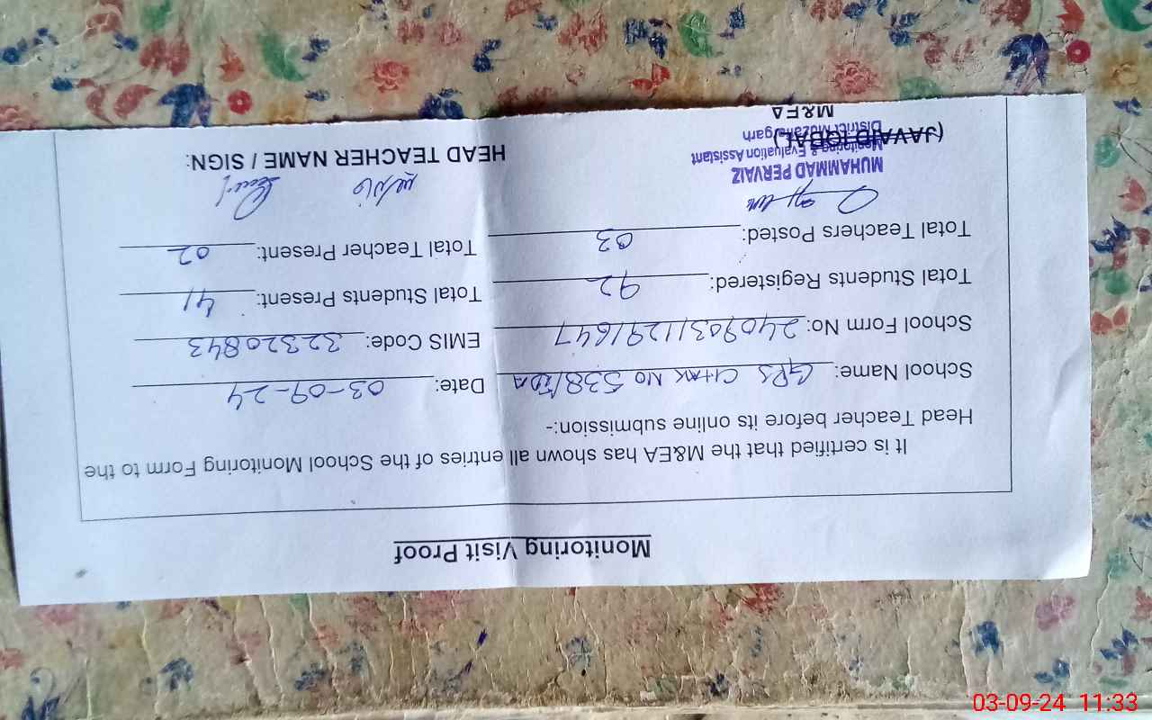 | EMIS Code: 32320843 | Name of School: GPS CHAK NO.538 TDA | |||
