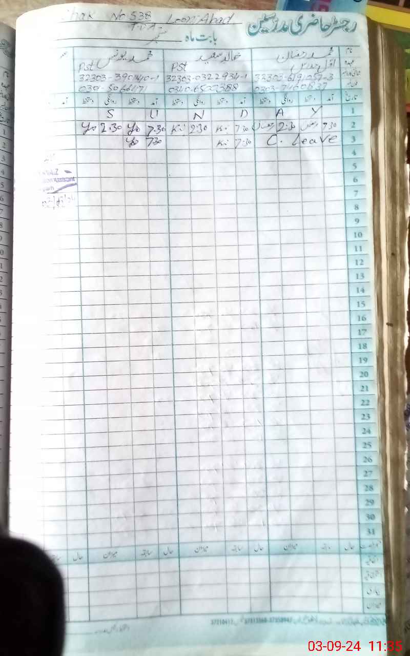 | CNIC | Full Name | Designation | R/C | Absence During Last Calender Month |