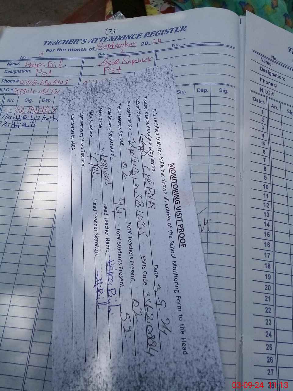 | Attendance Register | Head Teacher | MEA with School | Visit Proof |