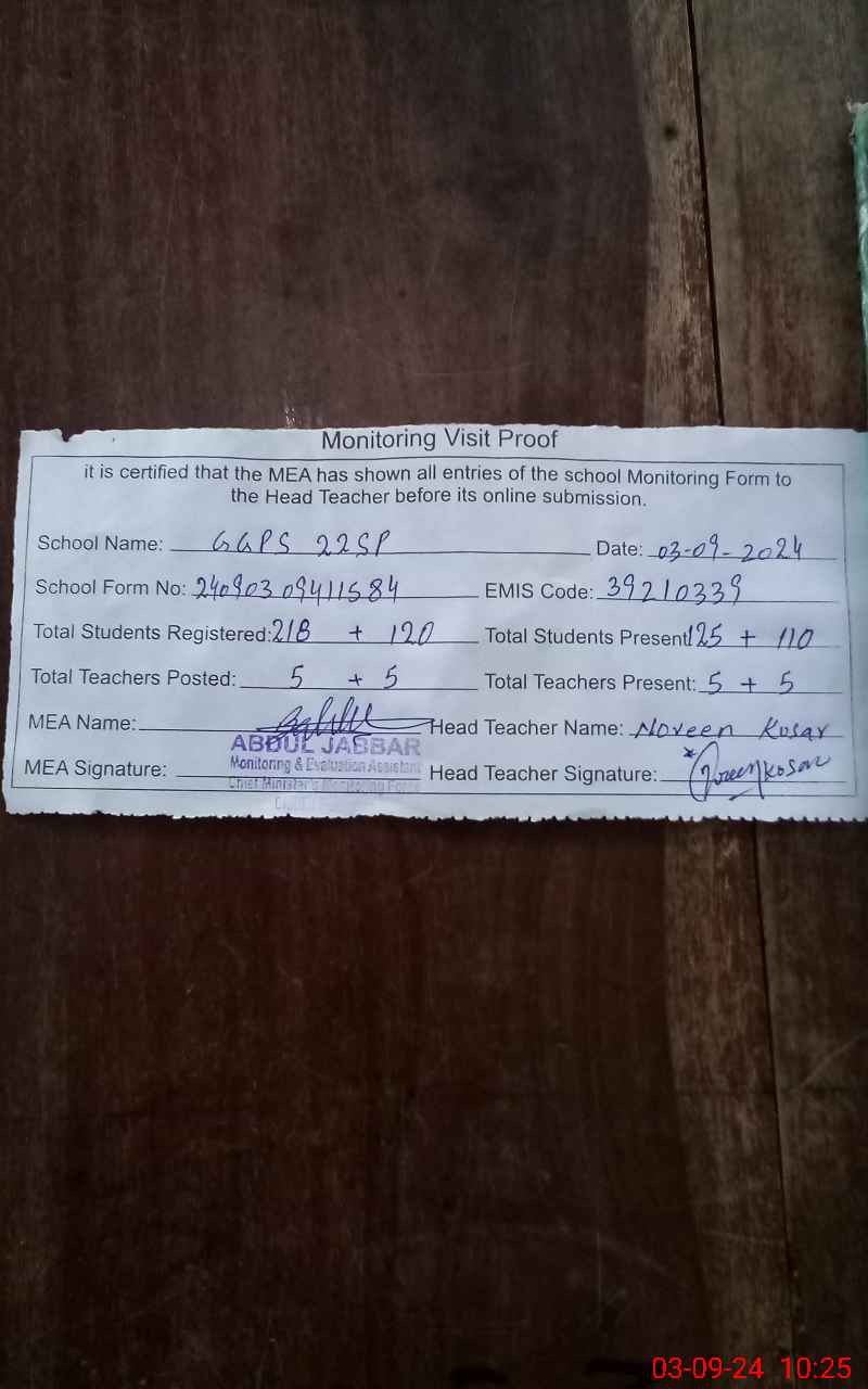 | EMIS Code: 39210339 | Name of School: GGPS 22 SP | |||